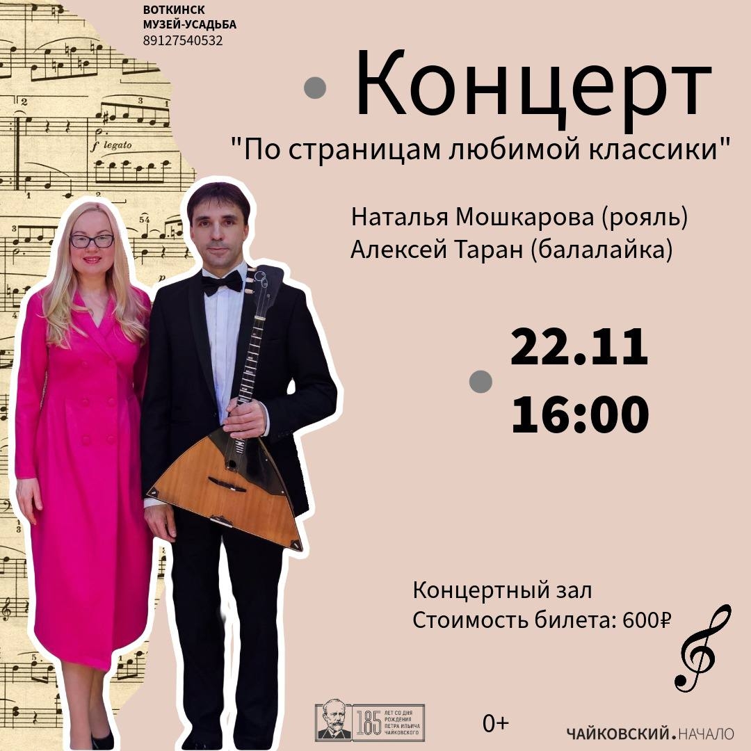 В исполнении Алексея Тарана (балалайка) и Натальи Мошкаровой (рояль) прозвучат любимые многими классические мелодии Чайковского, Шумана, Рахманинова, Штрауса и Листа.