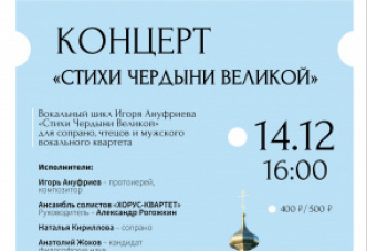 «Стихи Чердыни Великой» – концертная программа, которую представит ансамбль солистов «Хорус-квартет». Программа написана пермским композитором Игорем Ануфриевым для сопрано, чтецов и мужского вокального квартета.