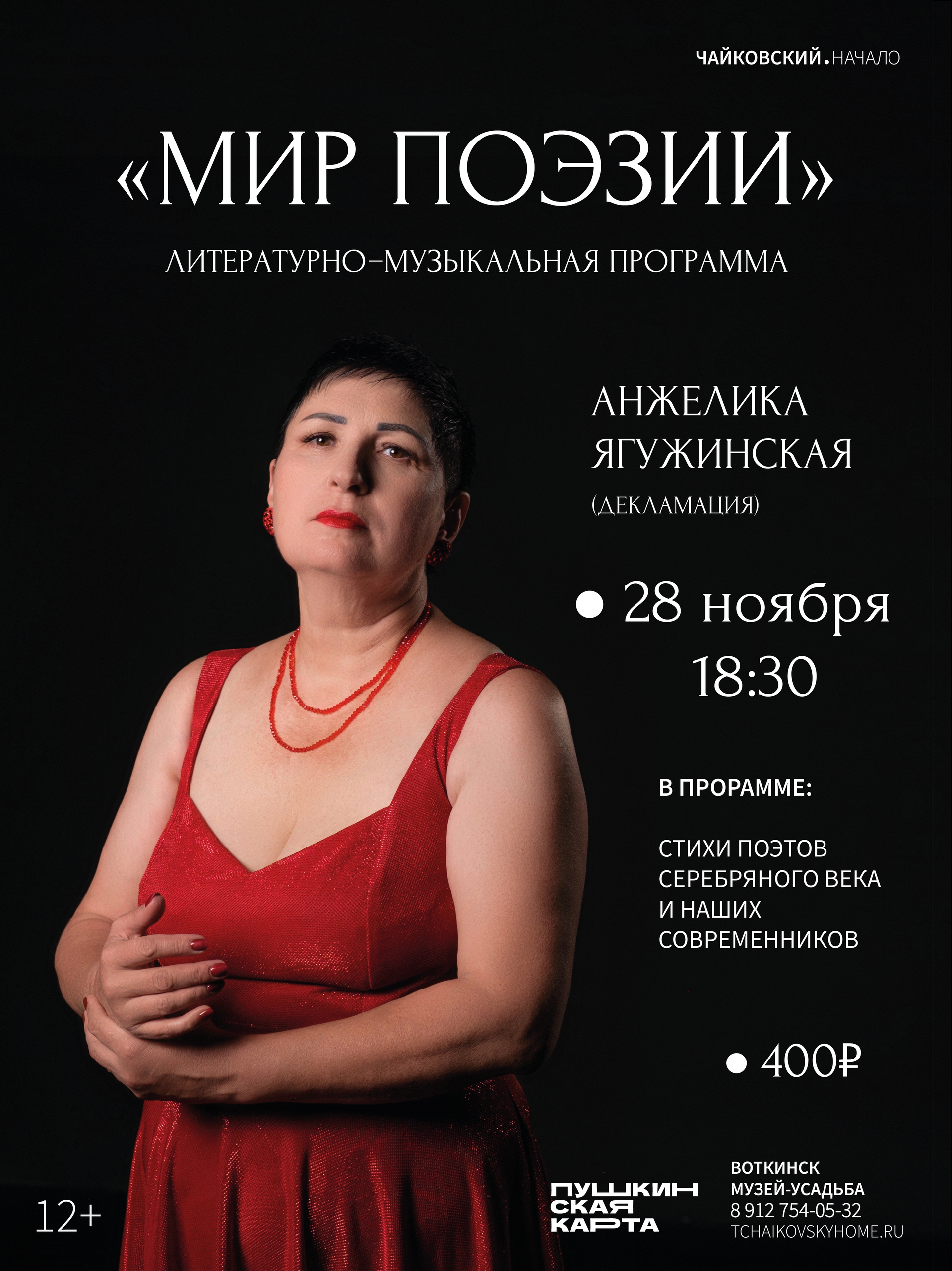 28 ноября на сцене концертного зала музея-усадьбы пройдет музыкально-поэтический вечер Анжелики Ягужинской. В программе прозвучат шедевры поэзии Серебряного века и современных авторов
